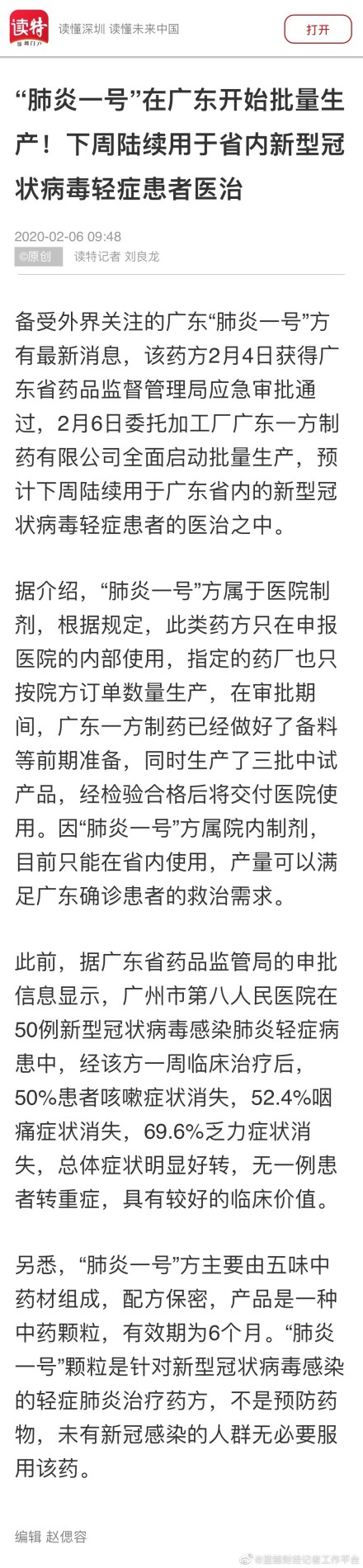 备受外界关注的广东“肺炎一号”方有最新消息,该药方2月4日获得广东省药品监督管理局应急审批通过,2月6日委托加工厂广东一方制药有限公司全面启动批量生产,预计下周陆续用于广东省内的新型冠状病毒轻症患者的医治之中。“肺炎一号”方主要由五味中药材组成,配方保密,产品是一种中药颗粒,有效期为6个月。“肺炎一号”颗粒是针对新型冠状病毒感染的轻症肺炎治疗药方,不是预防药物,未有新冠感染的人群无必要服用该药。