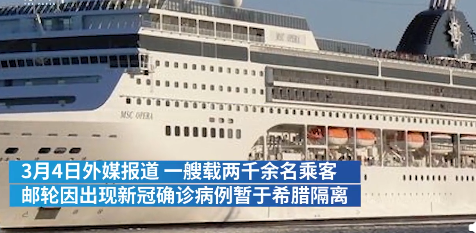 希腊一游轮两千乘客船上留观3月4日外媒报道,地中海邮轮公司旗下“歌剧”号一名奥地利乘客下船后被确诊感染新冠肺炎。